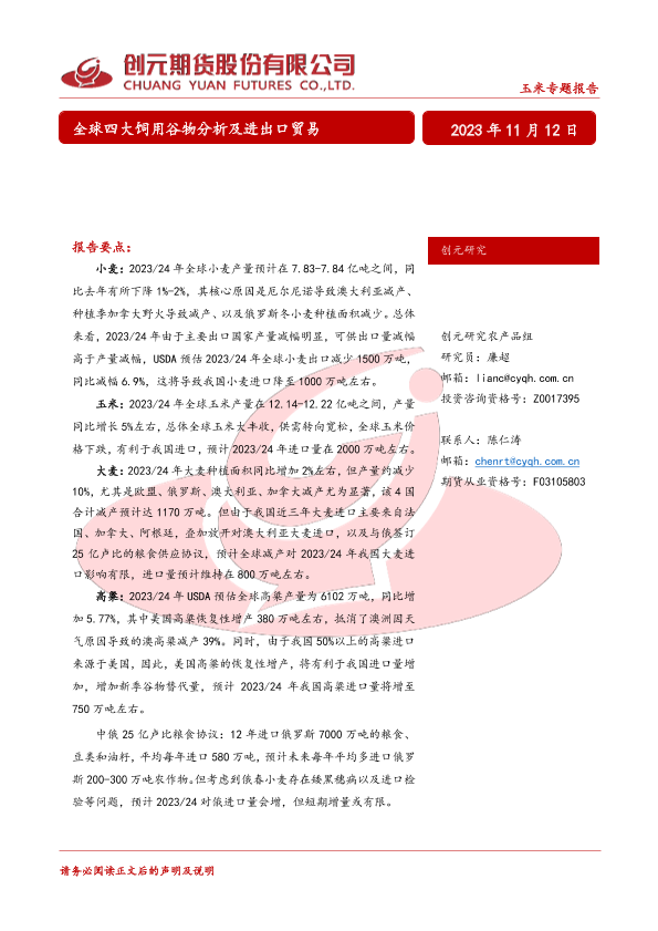 【创元期货】【20231112】玉米专题报告:全球四大饲用谷物分析及进出口贸易-31页