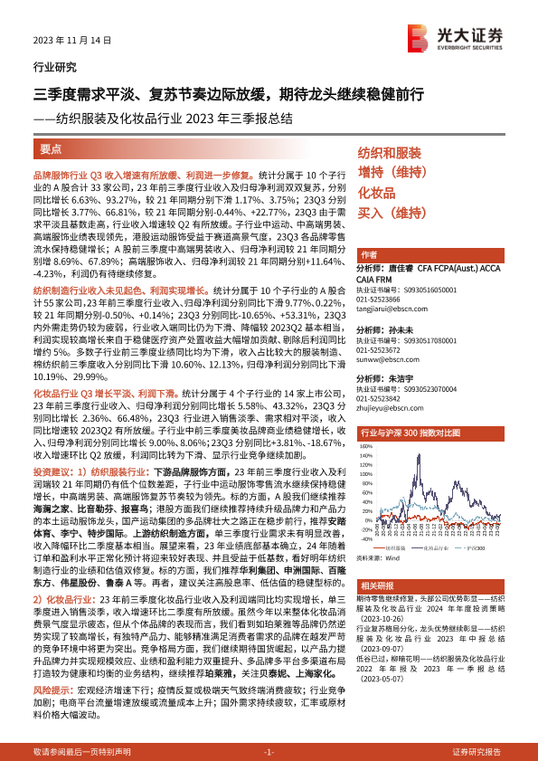 【光大证券】【20231114】纺织服装及化妆品行业2023年三季报总结:三季度需求平淡、复苏节奏边际放缓,期待龙头继续稳健前行-20页
