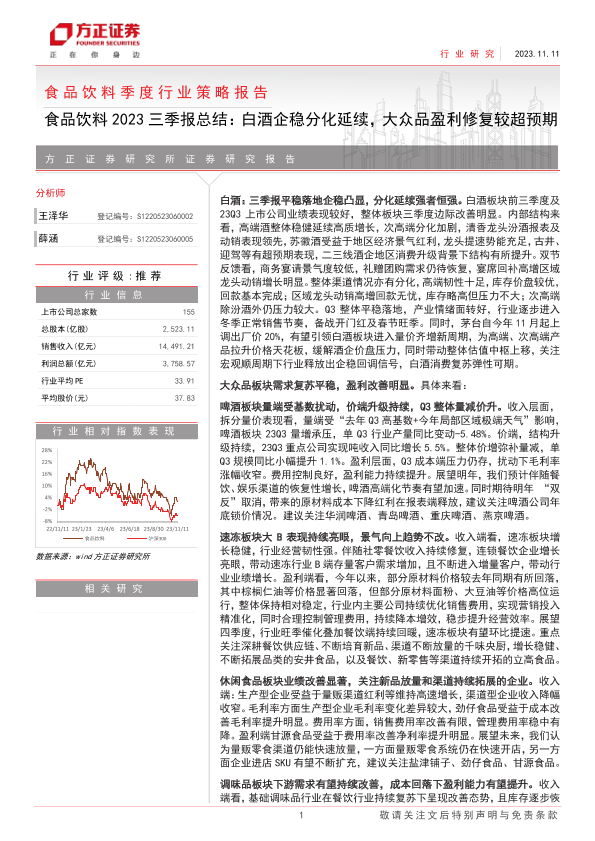 【方正证券】【20231111】食品饮料行业2023三季报总结:白酒企稳分化延续,大众品盈利修复较超预期-48页