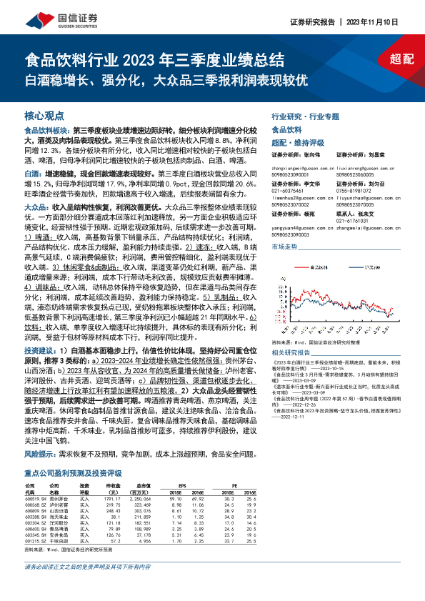 【国信证券】【20231110】食品饮料行业2023年三季度业绩总结:白酒稳增长、强分化,大众品三季报利润表现较优-34页