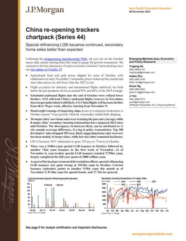 【J.P. Morgan】【20231106】FI-China re-opening trackers chartpack (Series 44) Special refinancing LGB issuance continued, secondary home sales better than expected-13页