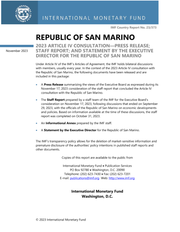 【国际货币基金组织】【20231122】IMF-圣马力诺共和国:2023 年第四条磋商-新闻稿;员工报告;以及圣马力诺共和国执行主任的发言-85页
