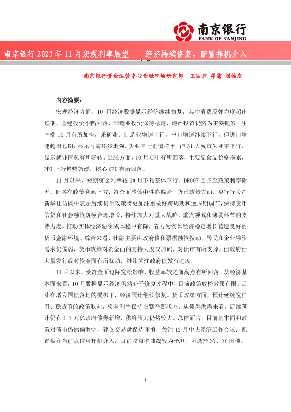 【南京银行资金运营中心金融市场研究部】【202311】经济持续修复,配置择机介入——南京银行11月宏观利率展望-30页