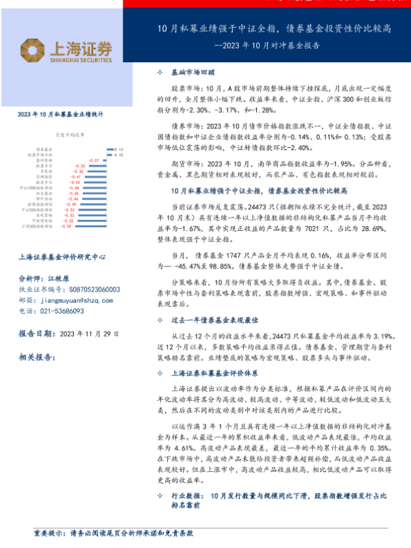 【上海证券】【20231129】2023年10月对冲基金报告:10月私募业绩强于中证全指,债券基金投资性价比较高-18页