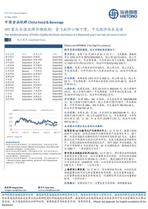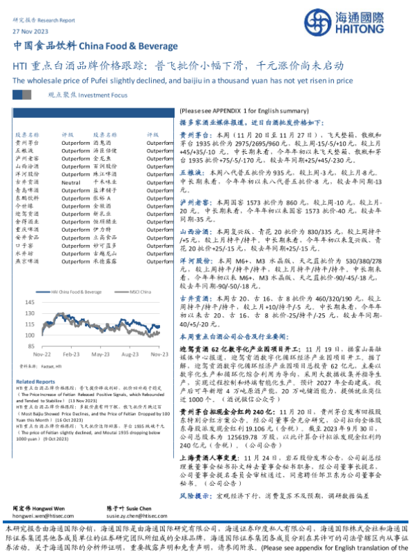 【海通国际】【20231127】中国食品饮料:HTI重点白酒品牌价格跟踪:普飞批价小幅下滑,千元涨价尚未启动-12页