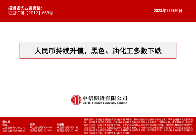 【中信期货】【20231130】人民币持续升值,黑色、油化工多数下跌-15页