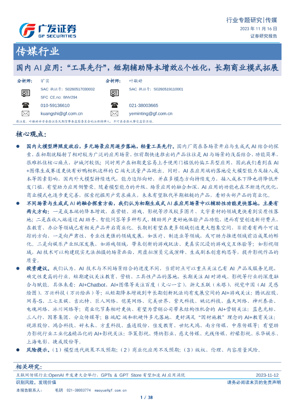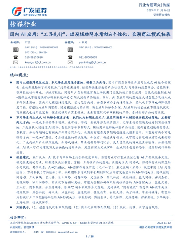 【广发证券】【20231116】传媒行业国内AI应用:“工具先行”,短期辅助降本增效&个性化,长期商业模式拓展-37页