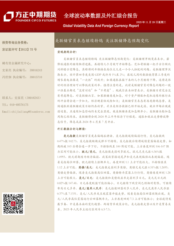 【方正中期期货】【20231129】全球波动率数据及外汇综合报告:美联储官员表态继续转鸽 关注联储降息预期变化-18页