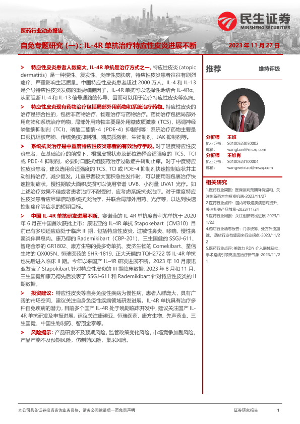 【民生证券】【20231127】医药行业动态报告:自免专题研究(一):IL-4R单抗治疗特应性皮炎进展不断-13页