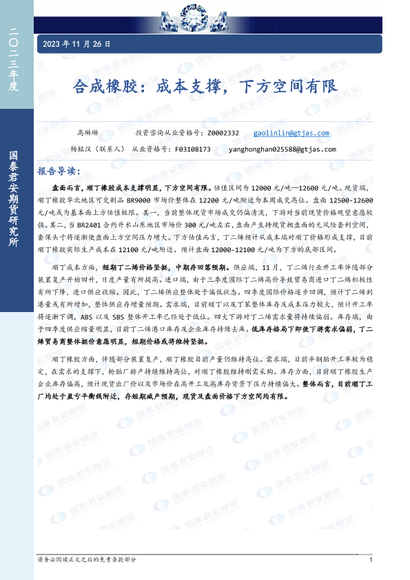 【国泰君安期货】【20231126】合成橡胶:成本支撑,下方空间有限-12页