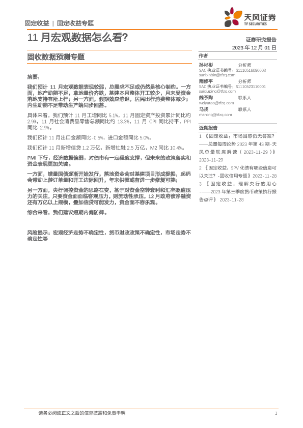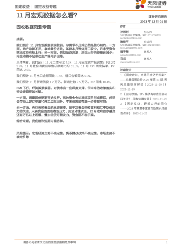 【天风证券】【20231201】固收数据预测专题:11月宏观数据怎么看?-20页