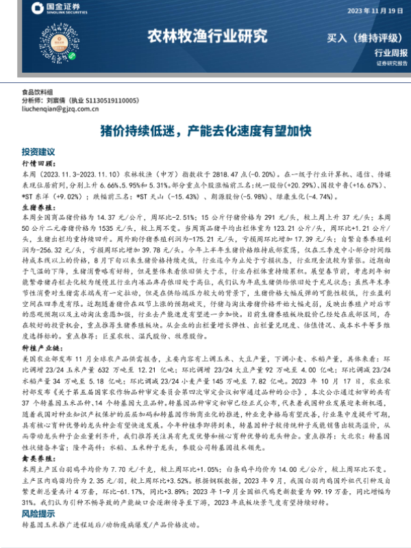 【国金证券】【202311】国金证券:农林牧渔行业研究-猪价持续低迷-产能去化速度有望加快-13页