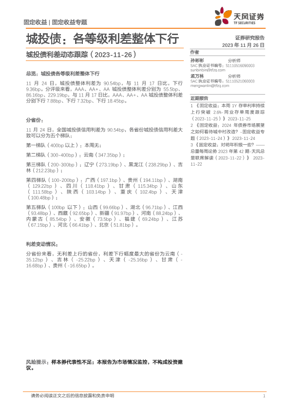 【天风证券】【20231126】城投债利差动态跟踪:城投债:各等级利差整体下行-11页