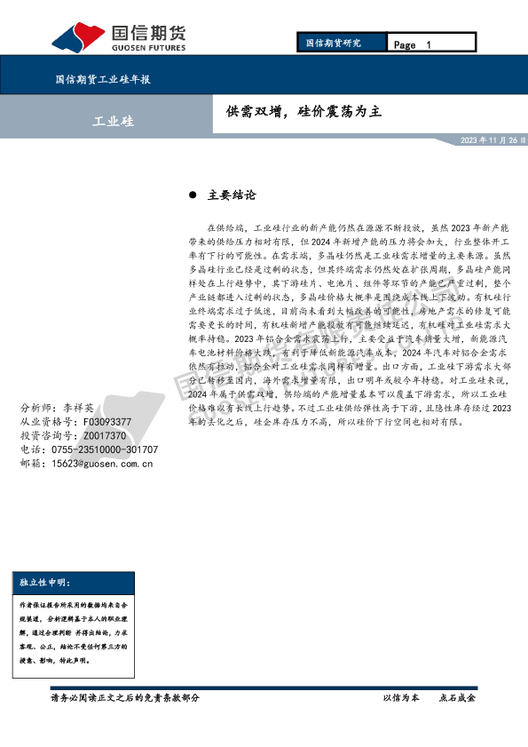 【国信期货】【20231126】有色(工业硅)2024年年报:供需双增,硅价震荡为主-18页