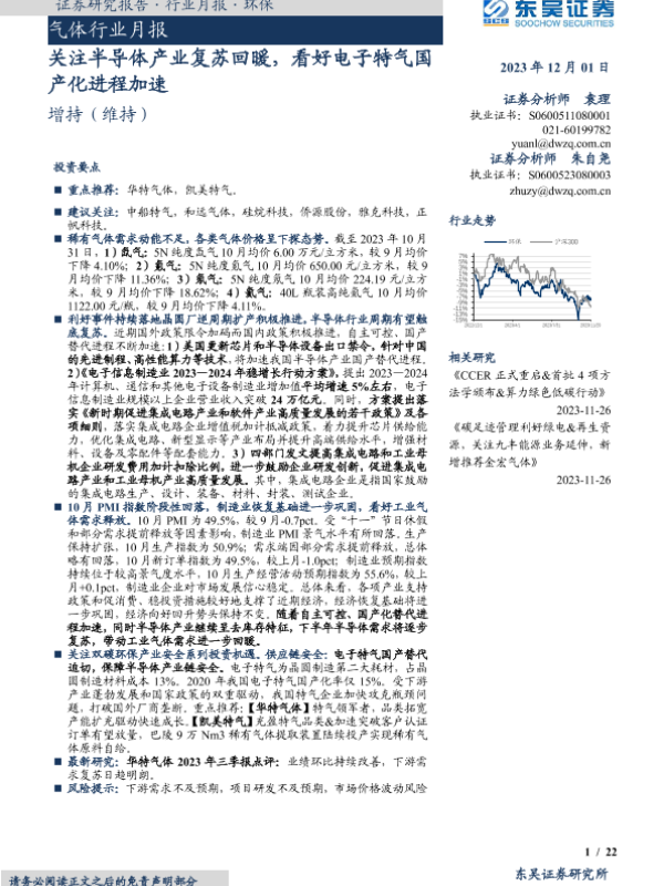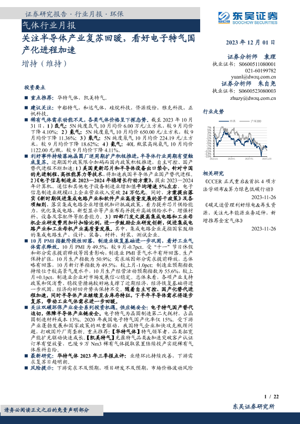 【东吴证券】【20231201】气体行业月报:关注半导体产业复苏回暖,看好电子特气国产化进程加速-22页