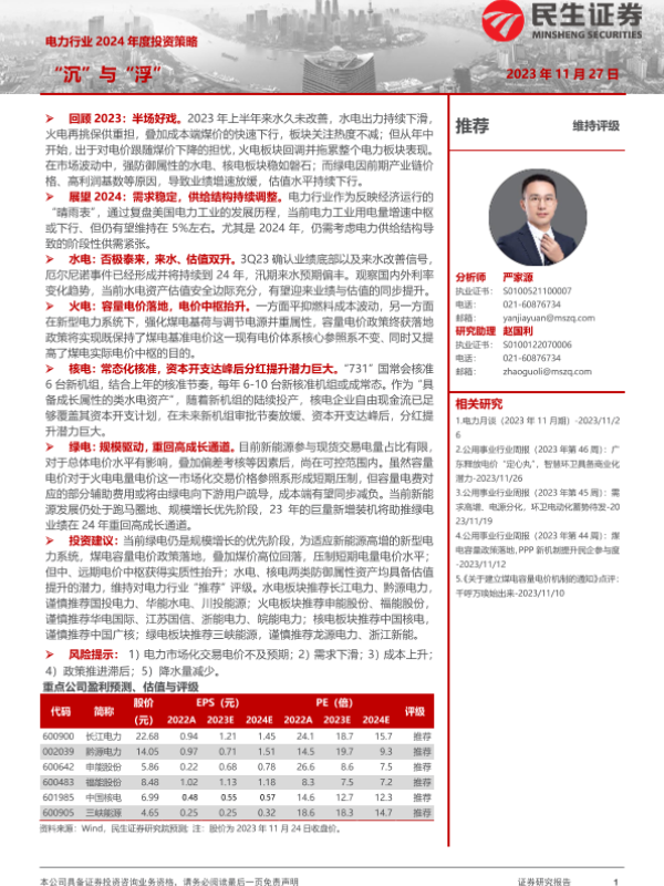 【民生证券】【20231127】电力行业2024年度投资策略:“沉”与“浮”-51页