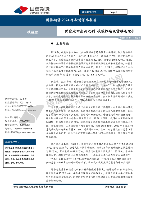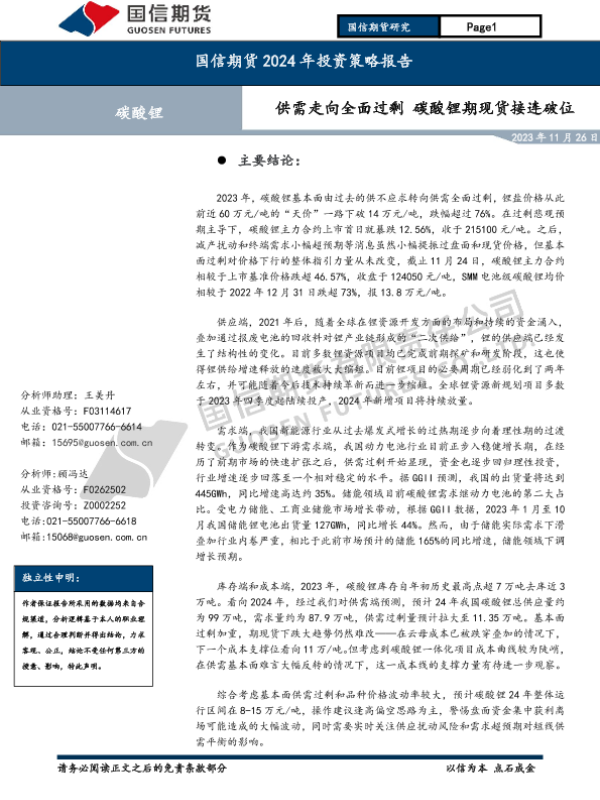 【国信期货】【20231126】碳酸锂2024年投资策略报告:供需走向全面过剩 碳酸锂期现货接连破位-28页