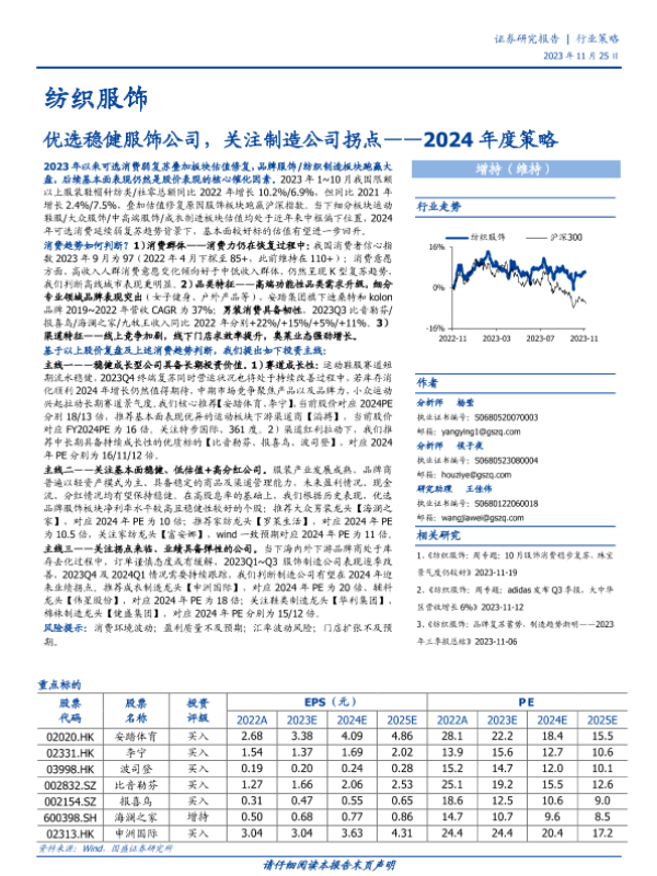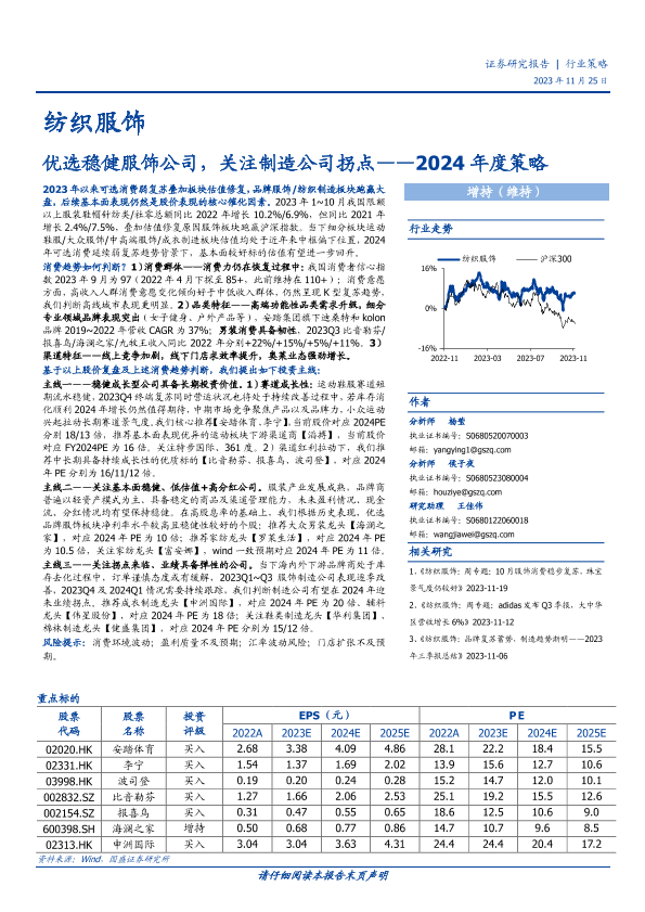 【国盛证券】【20231125】纺织服饰2024年度策略:优选稳健服饰公司,关注制造公司拐点-42页