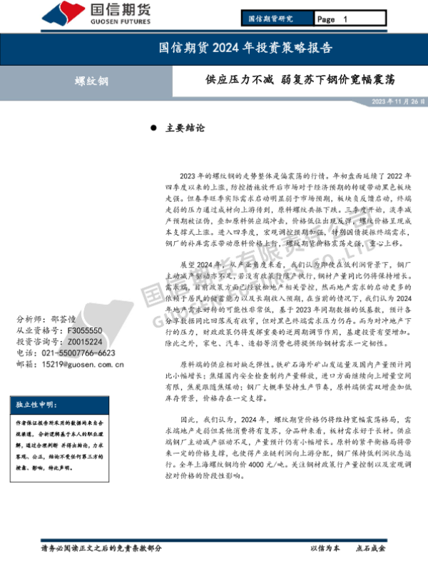 【国信期货】【20231126】螺纹钢2024年投资策略报告:供应压力不减 弱复苏下钢价宽幅震荡-17页