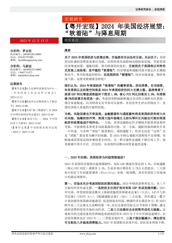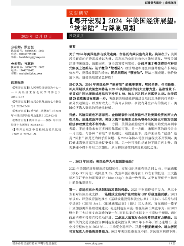 【粤开证券】【20231213】2024年美国经济展望:“软着陆”与降息周期-23页