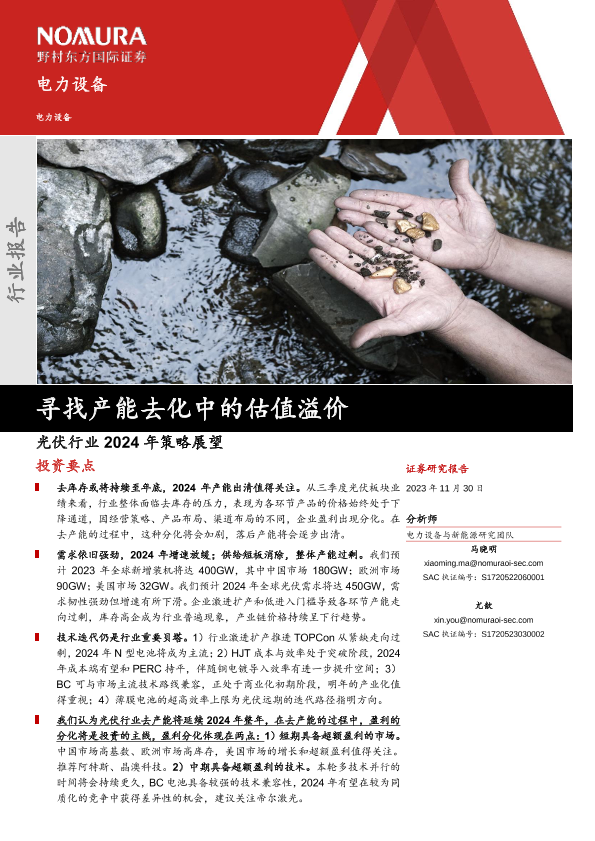 【野村东方国际证券】【20231130】光伏行业2024年策略展望:寻找产能去化中的估值溢价-38页