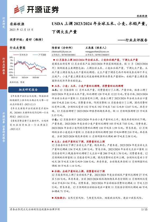 【开源证券】【20231215】农林牧渔行业点评报告:USDA上调2023 2024年全球玉米、小麦、水稻产量,下调大豆产量-15页