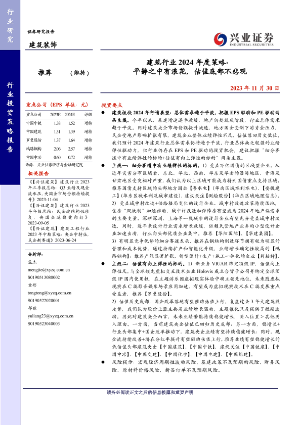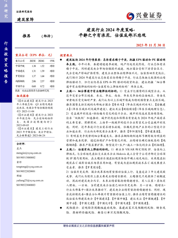 【兴业证券】【20231130】建筑行业2024年度策略:平静之中有浪花,估值底部不悲观-46页