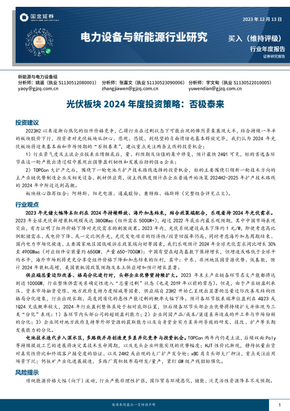 【国金证券】【20231213】电力设备与新能源行业光伏板块2024年度投资策略:否极泰来-54页