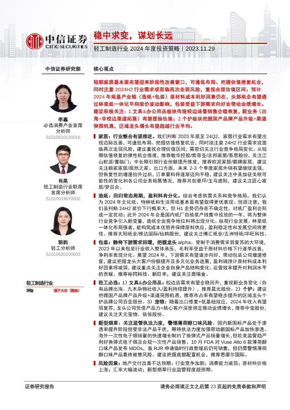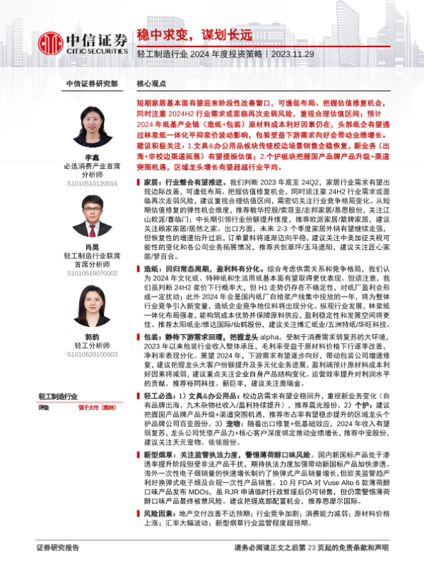 【中信证券】【20231129】轻工制造行业2024年度投资策略:稳中求变,谋划长远-23页
