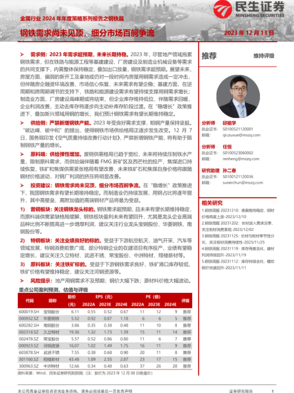 【民生证券】【20231213】金属行业2024年年度策略系列报告之钢铁篇:钢铁需求尚未见顶,细分市场百舸争流-39页