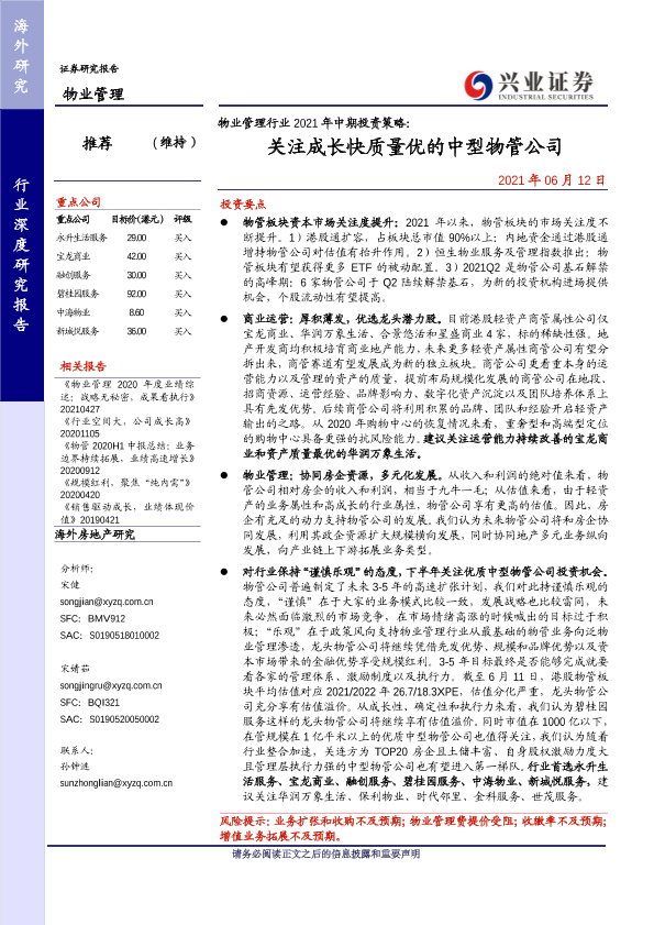 【兴业证券】【20210612】物业管理行业2021年中期投资策略:关注成长快质量优的中型物管公司-31页
