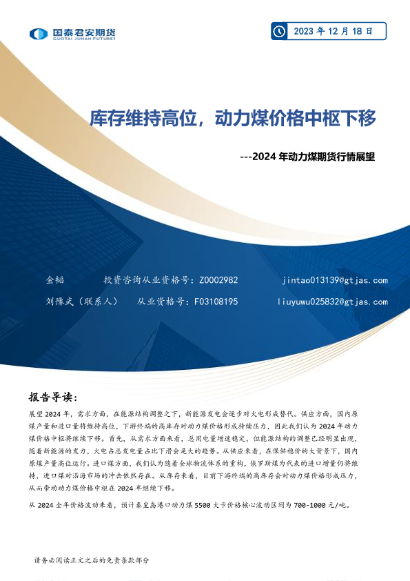 【国泰君安期货】【20231218】2024年动力煤期货行情展望:库存维持高位,动力煤价格中枢下移-19页