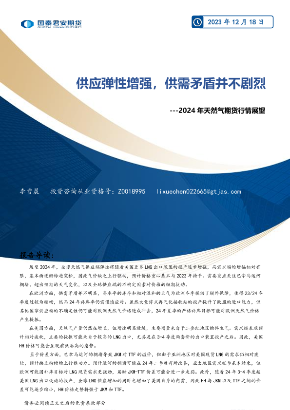 【国泰君安期货】【20231218】2024年天然气期货行情展望:供应弹性增强,供需矛盾并不剧烈-19页