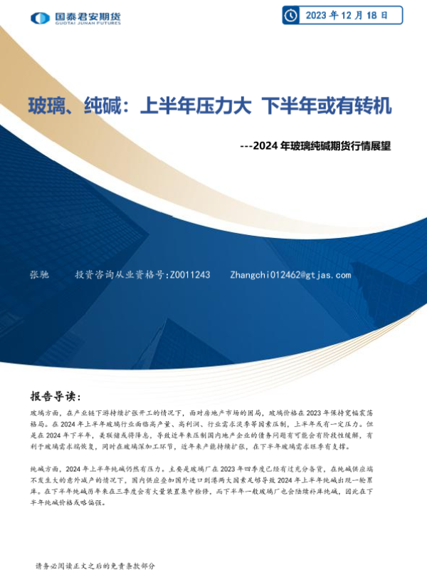 【国泰君安期货】【20231218】2024年玻璃纯碱期货行情展望:玻璃、纯碱:上半年压力大 下半年或有转机-26页