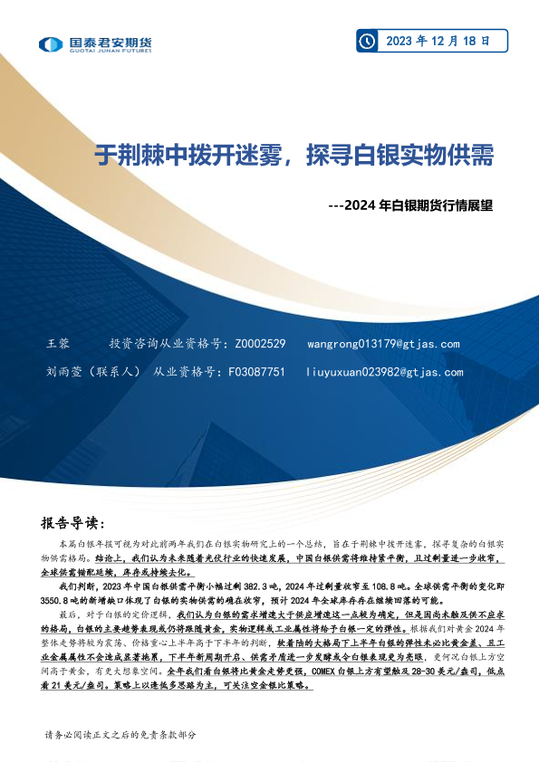 【国泰君安期货】【20231218】2024年白银期货行情展望:于荆棘中拨开迷雾,探寻白银实物供需-14页