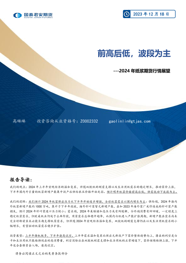 【国泰君安期货】【20231218】2024年纸浆期货行情展望:前高后低,波段为主-19页