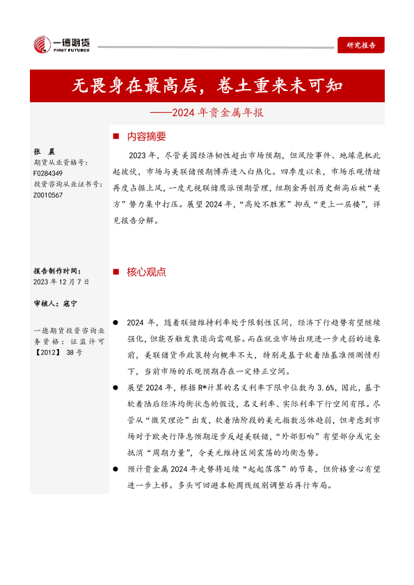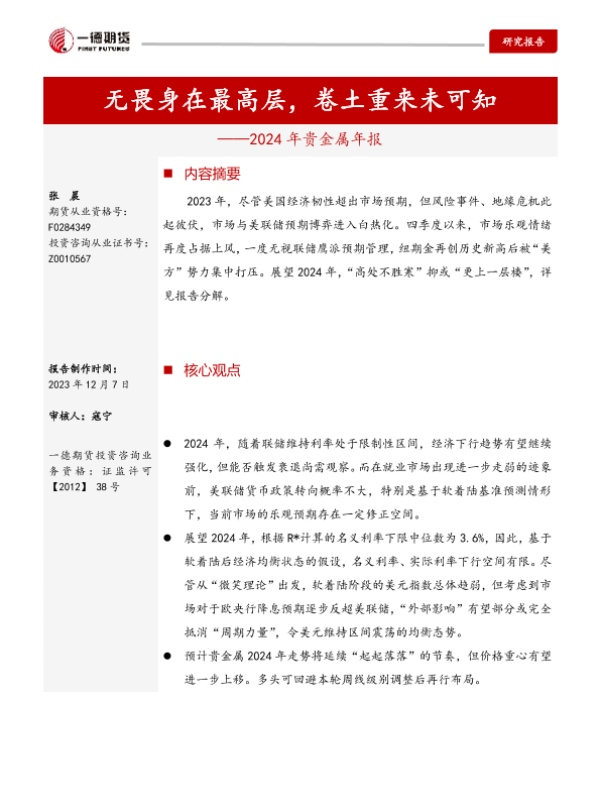 【一德期货】【20231207】2024年贵金属年报:无畏身在最高层,卷土重来未可知-16页
