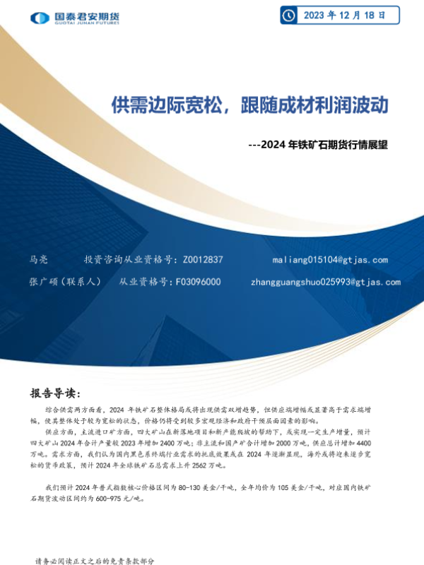 【国泰君安期货】【20231218】2024年铁矿石期货行情展望:供需边际宽松,跟随成材利润波动-21页