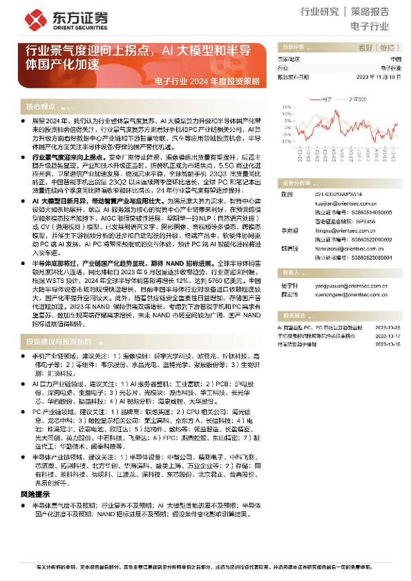 【东方证券】【20231119】电子行业2024年度投资策略:行业景气度迎向上拐点,AI大模型和半导体国产化加速-47页