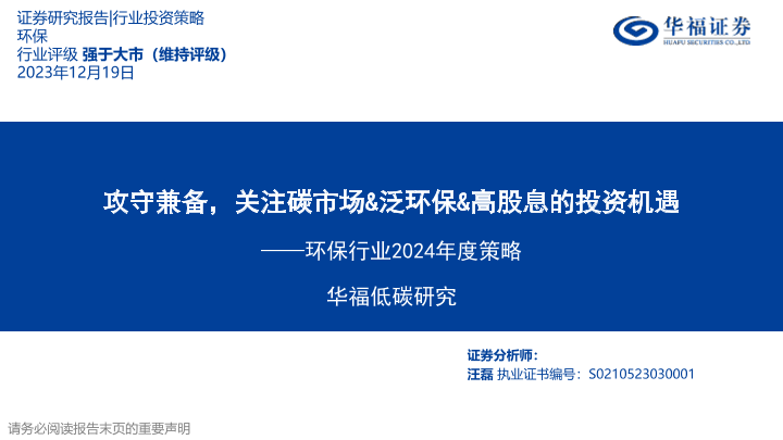 【华福证券】【20231219】环保行业2024年度策略:攻守兼备,关注碳市场&泛环保&高股息的投资机遇-29页