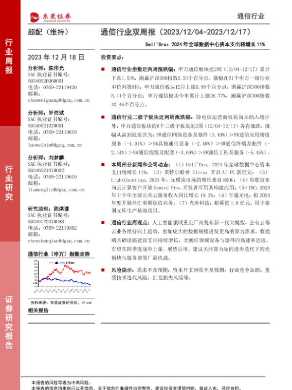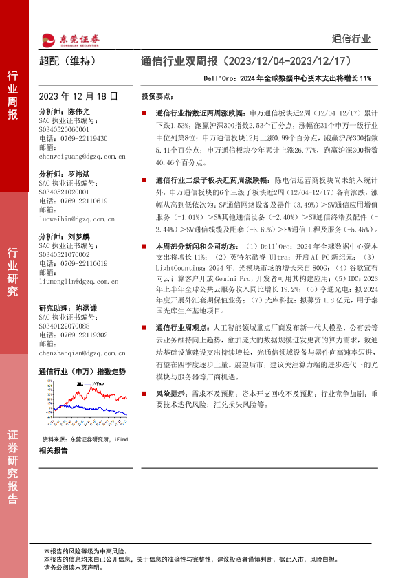 【东莞证券】【20231218】通信行业双周报:Dell’Oro,2024年全球数据中心资本支出将增长11%-12页