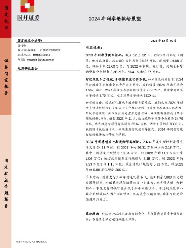 【国开证券】【20231225】2024年利率债供给展望-19页