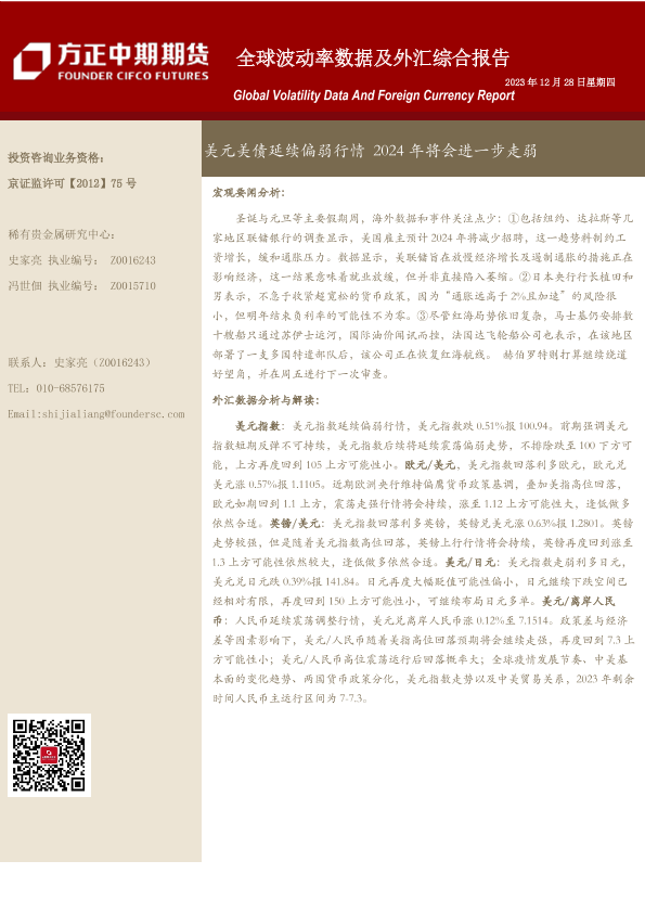 【方正中期期货】【20231228】全球波动率数据及外汇综合报告:美元美债延续偏弱行情 2024年将会进一步走弱-18页