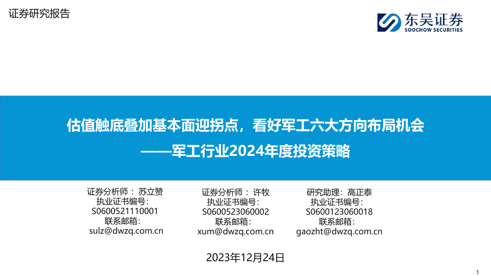 【东吴证券】【20231224】军工行业2024年度投资策略:估值触底叠加基本面迎拐点,看好军工六大方向布局机会-51页