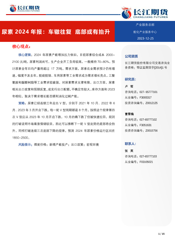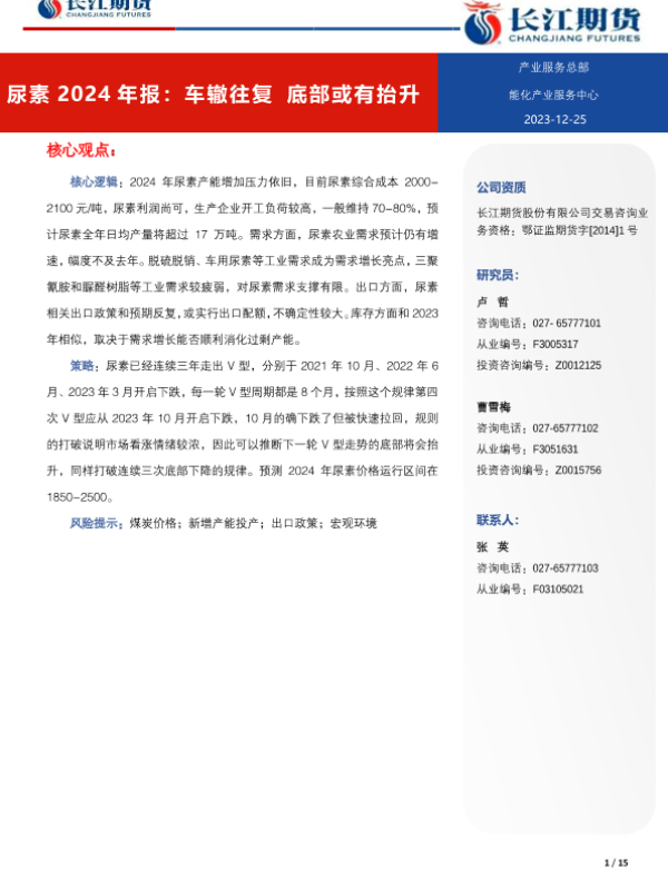 【长江期货】【20231225】尿素2024年报:车辙往复 底部或有抬升-15页