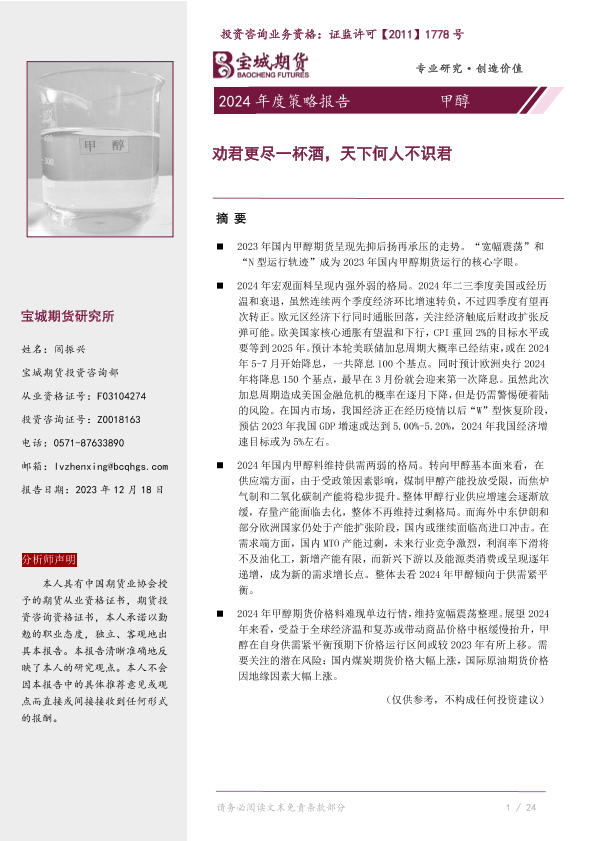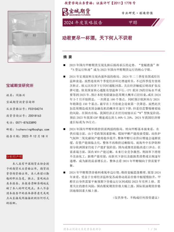 【宝城期货】【20231218】甲醇2024年度策略报告:劝君更尽一杯酒,天下何人不识君-25页