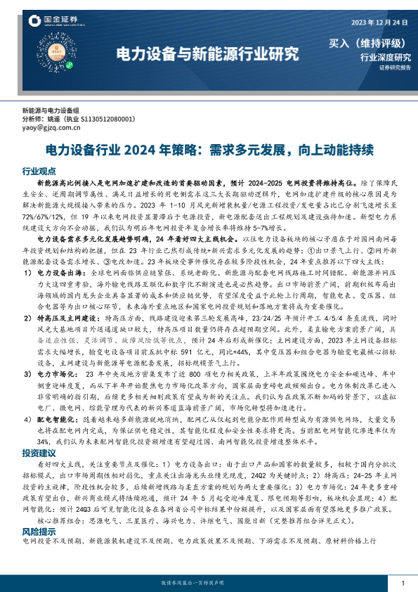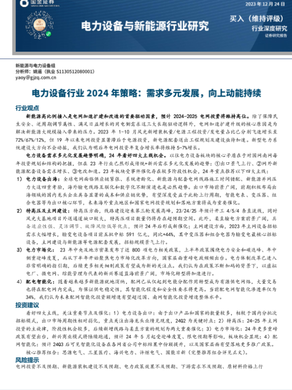 【国金证券】【20231224】电力设备行业2024年策略:需求多元发展,向上动能持续-28页
