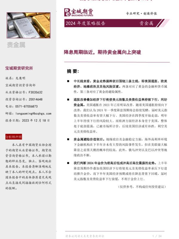 【宝城期货】【20231218】贵金属2024年度策略报告:降息周期临近,期待贵金属向上突破-20页