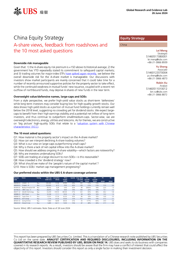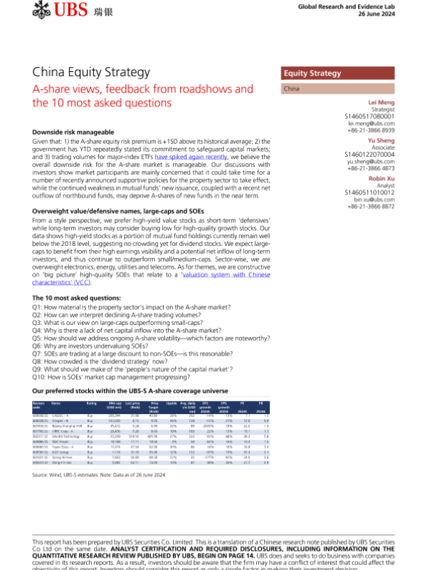 【UBS Securities Co. Limited】【20240626】UBS Equities-China Equity Strategy A-share views, feedback from roadshow and the 10 most asked questions-18页