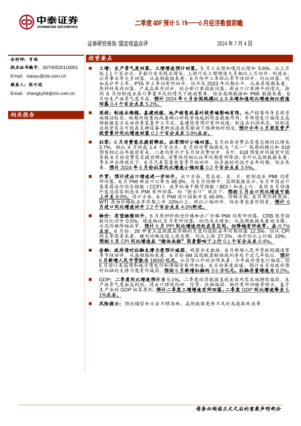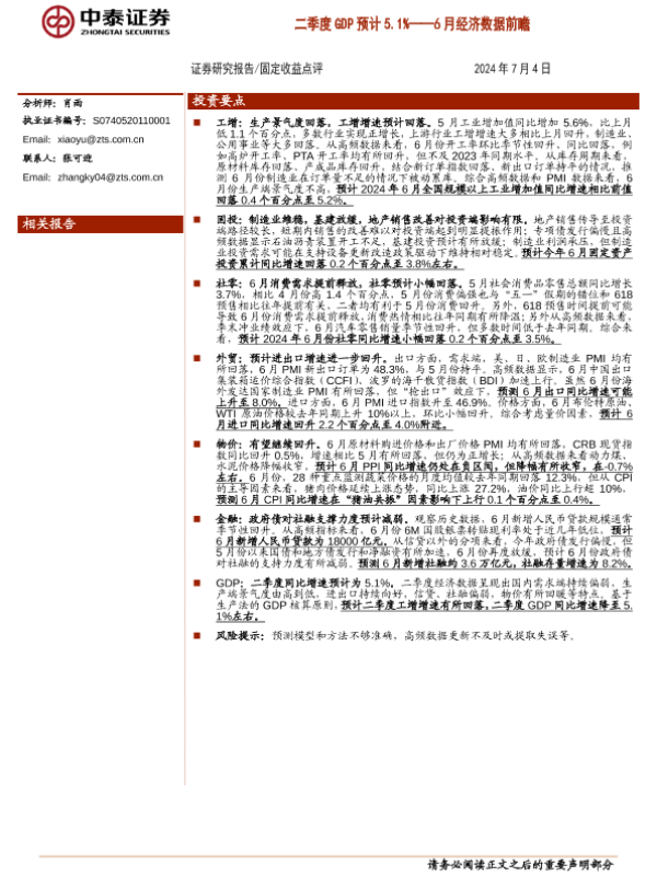 【中泰证券】【20240704】6月经济数据前瞻:二季度GDP预计5.1%-15页